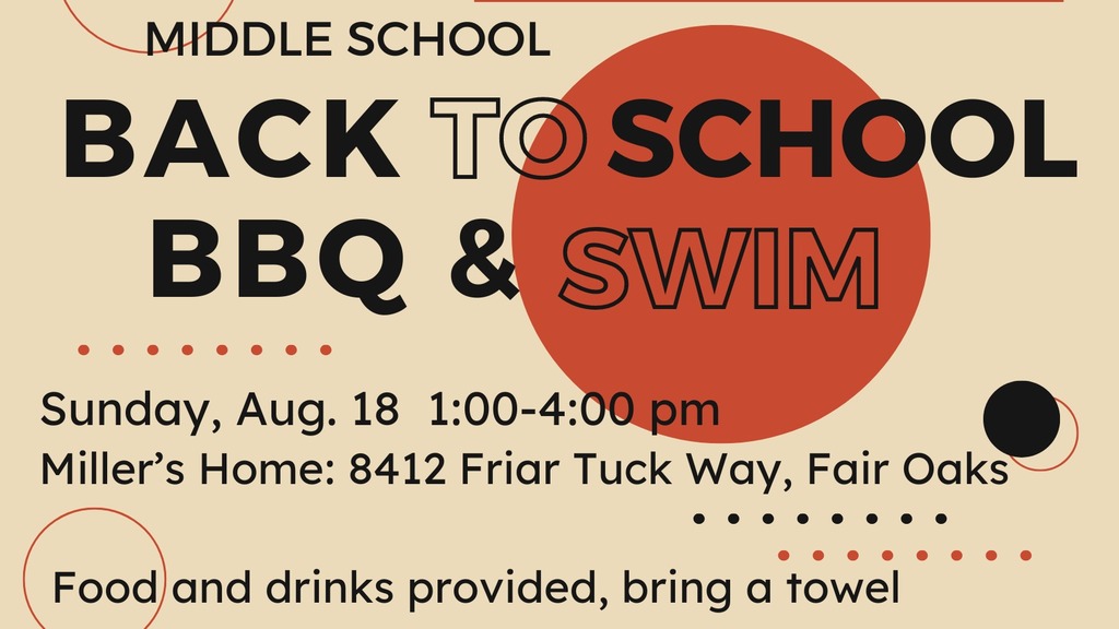 Back to School MS BBQ & SwimAug 18, 2024 at 1:00 PMOrganizer: Melisa ConwellLocation:Miller's Home8412 Friar Tuck WayFair Oaks, CA 95628Get Directions