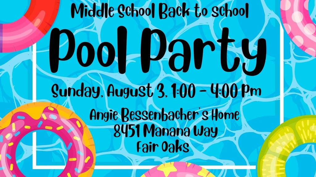 MS Back to School Pool PartyAug 3, 2025 at 1:00pmLocation:Bessenbacher Home8451 Manana WayFair Oaks, CA 95628Get Directions