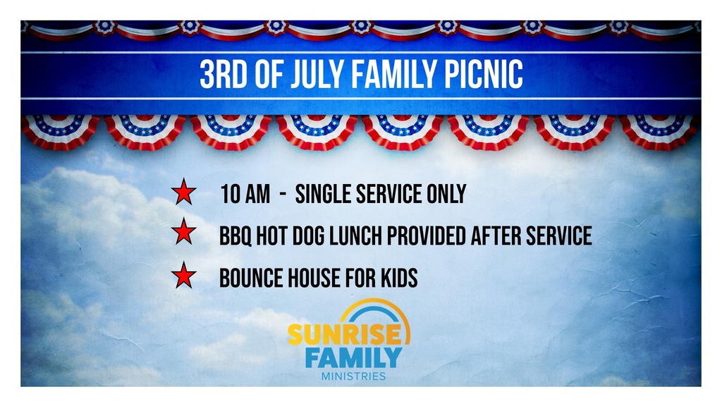 Join us today for a Single Church Service at 10am followed by a Church Family Picnic with a BBQ Hot Dog lunch provided after the service.